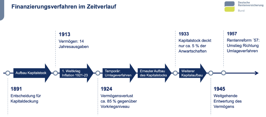 Denn die gesetzliche Rentenversicherung war bis 1957 nahezu vollständig auf Anlagen an den Kapitalmärkten ausgerichtet. Dabei kam es zu zwei Totalzusammenbrüchen der angesparten Finanzanlagen (1924 und 1945).
